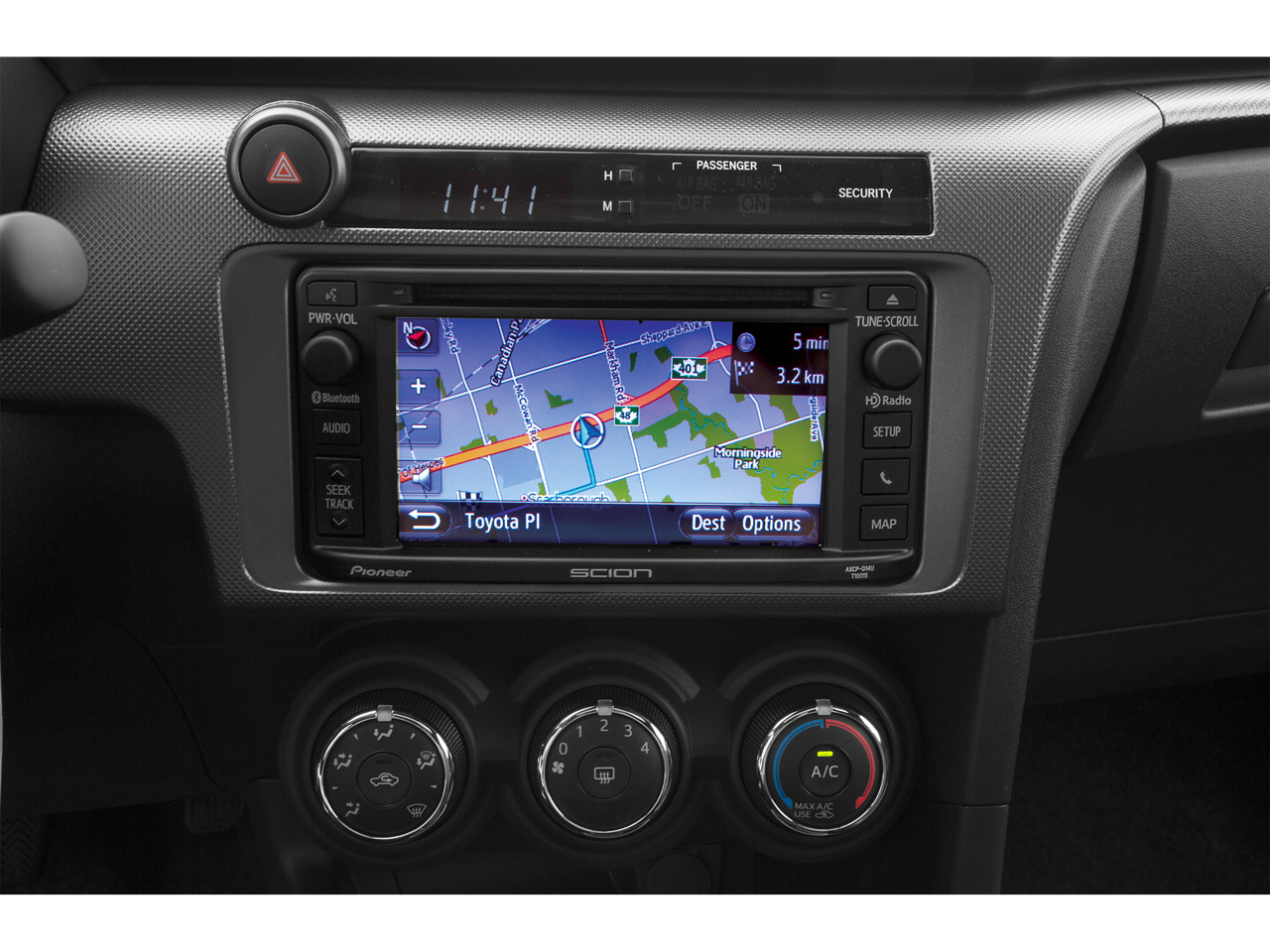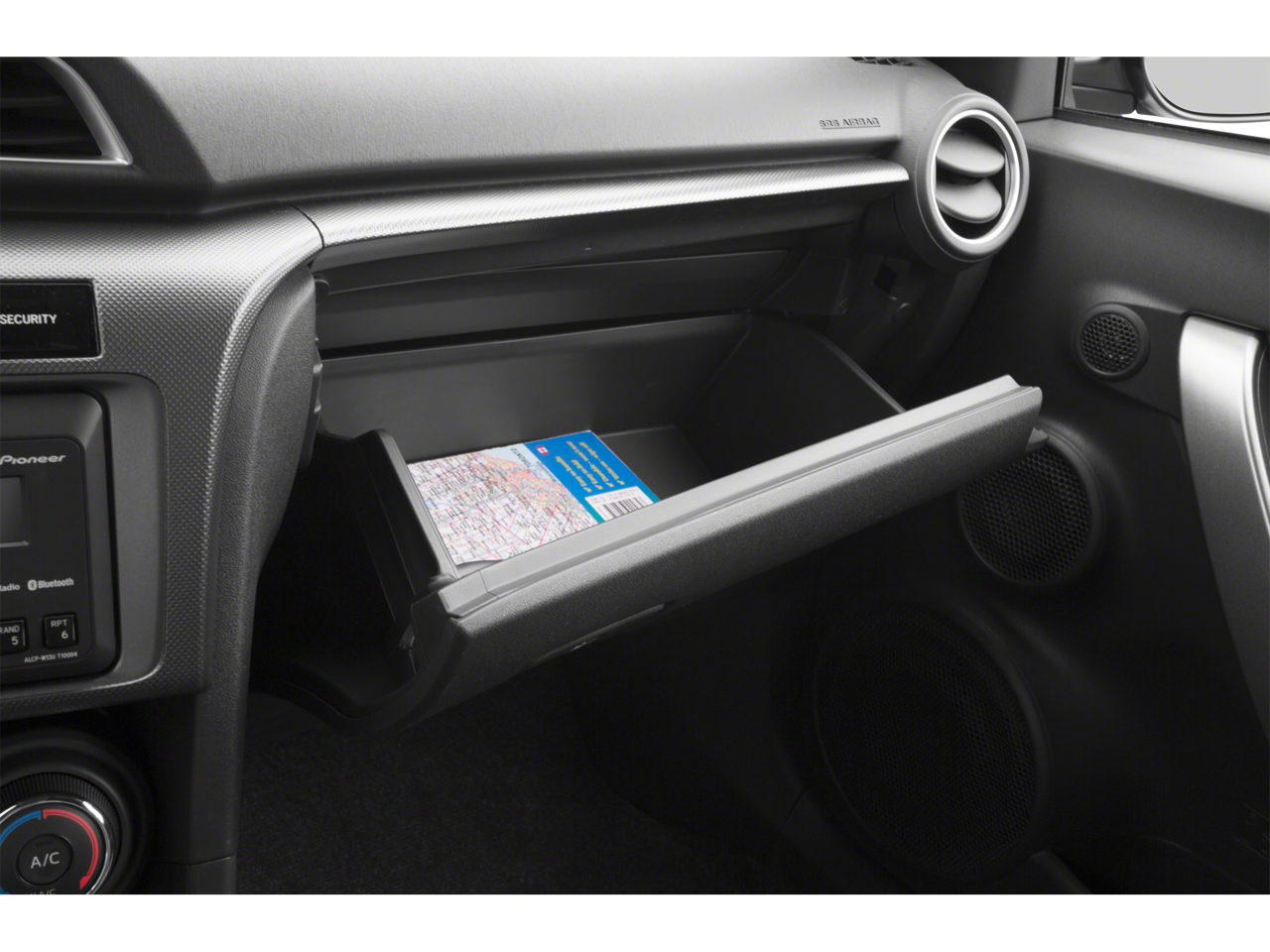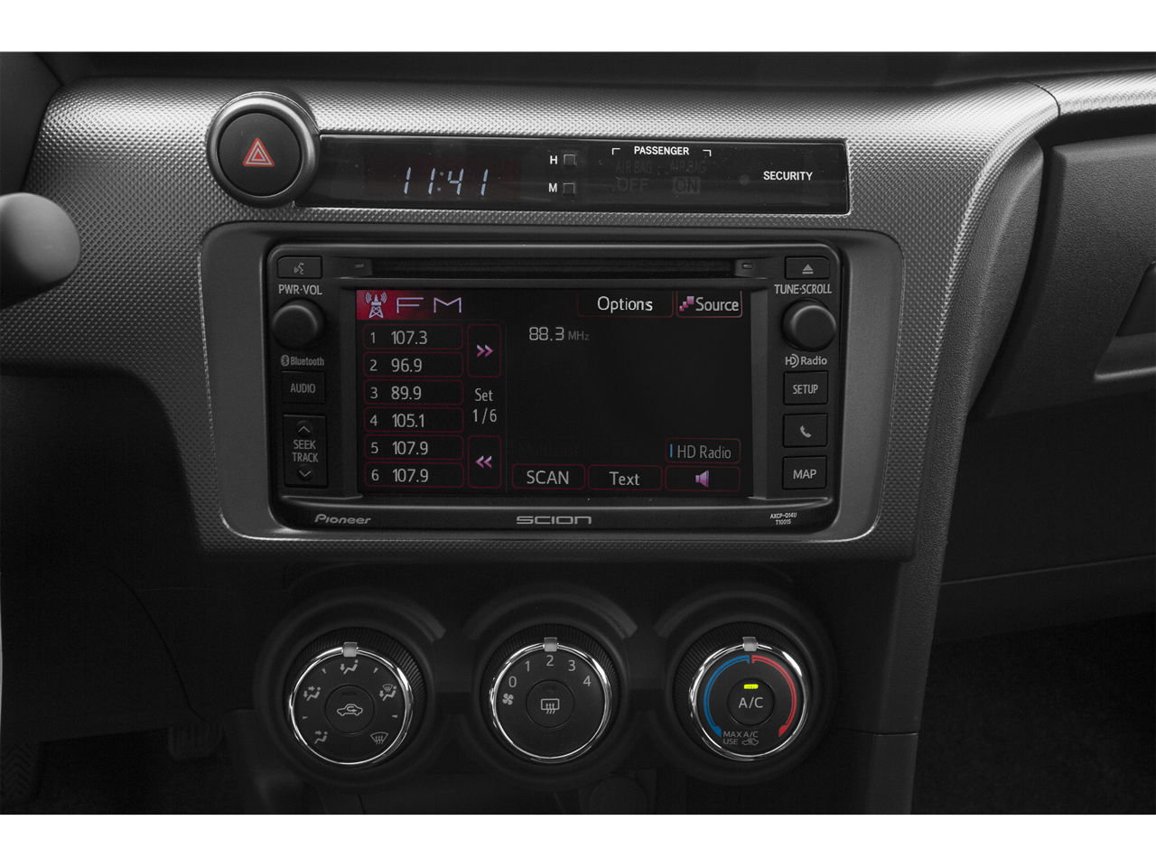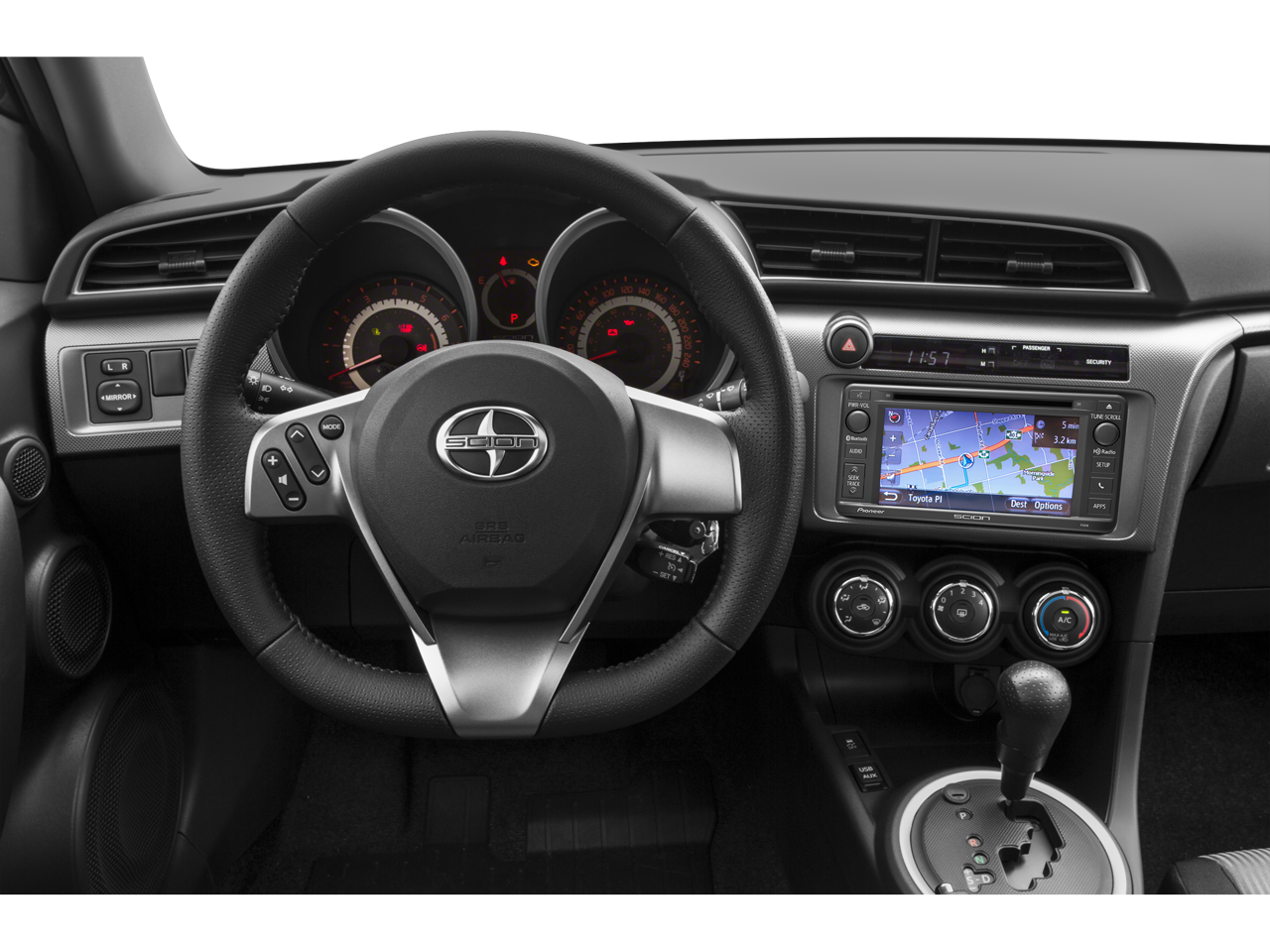 This tC is nicely equipped with 4-Wheel Disc Brakes, 8 Speakers, ABS brakes, Air Conditioning, Alloy wheels, AM/FM radio, Anti-whiplash front head restraints, Brake assist, Bumpers: body-color, CD player, Driver door bin, Driver vanity mirror, Dual front impact airbags, Dual front side impact airbags, Electronic Stability Control, Fabric Upholstery, Four wheel independent suspension, Front anti-roll bar, Front Bucket Seats, Front Center Armrest, Front reading lights, Front Sport Bucket Seats, Illuminated entry, Knee airbag, Low tire pressure warning, Occupant sensing airbag, Outside temperature display, Overhead airbag, Panic alarm, Passenger door bin, Passenger vanity mirror, Power door mirrors, Power moonroof, Power steering, Power windows, Premium audio system: Pioneer, Radio data system, Radio: AM/FM/CD Pioneer, Rear anti-roll bar, Rear window defroster, Remote keyless entry, Speed control, Split folding rear seat, Steering wheel mounted audio controls, Tachometer, Telescoping steering wheel, Tilt steering wheel, Traction control, Turn signal indicator mirrors, Variably intermittent wipers, and Wheels: 18 x 7.5 Split 5-Spoke Alloy.