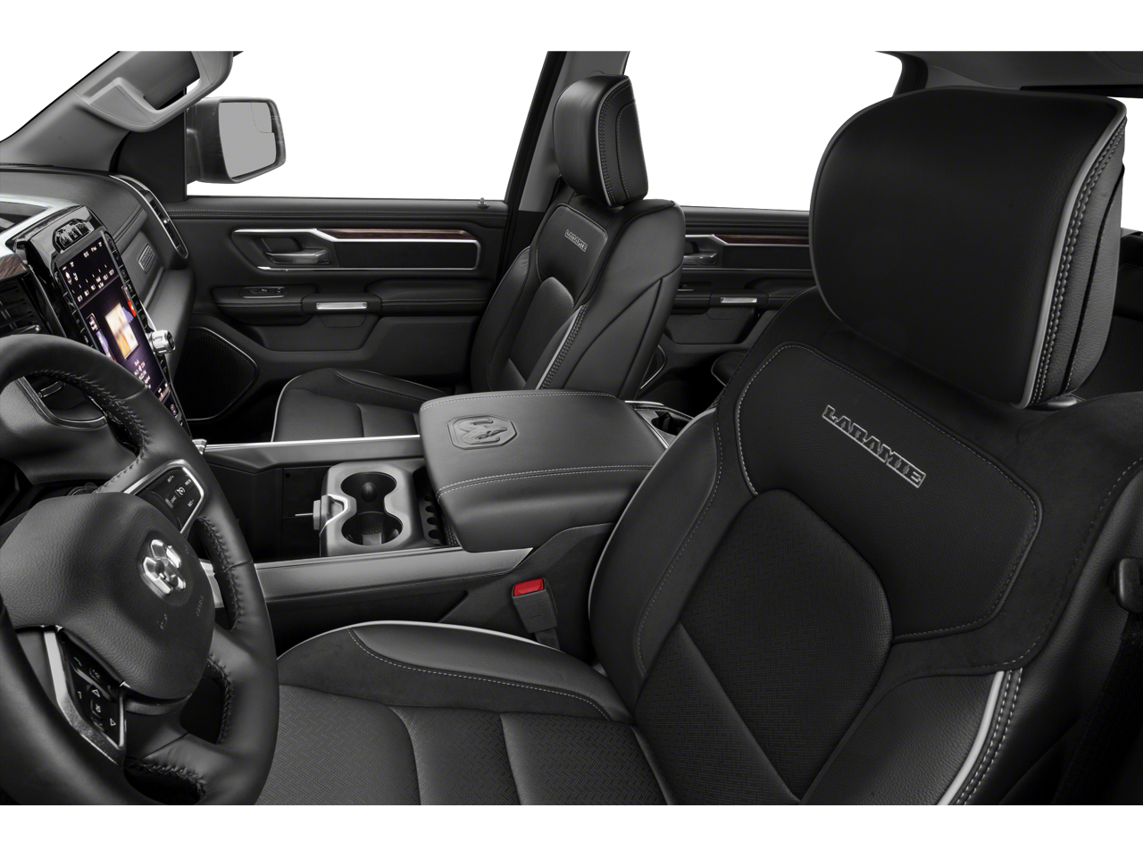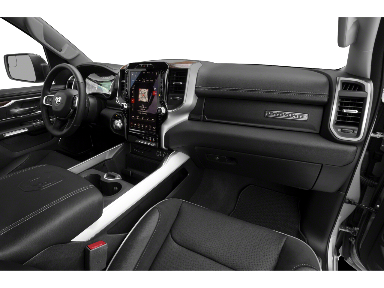 This 1500 Laramie is nicely equipped with Laramie Level 1 Equipment Group (Single Disc Remote CD Player), Quick Order Package 27H Laramie, #1 Seat Foam Cushion, 1-Yr SiriusXM Guardian Trial, 10 Speakers, 3 Rear Seat Head Restraints, 3.21 Rear Axle Ratio, 4 Way Front Headrests, 4-Wheel Disc Brakes, 48V Belt Starter Generator, 5-Year SiriusXM Traffic Service, 5-Year SiriusXM Travel Link Service, 8.4 Touchscreen Display, ABS brakes, Adjustable pedals, Air Conditioning, Alloy wheels, AM/FM radio: SiriusXM, Apple CarPlay, Apple CarPlay/Android Auto, Audio memory, Auto-dimming door mirrors, Auto-dimming Rear-View mirror, Automatic temperature control, Brake assist, Bumpers: chrome, Compass, Delay-off headlights, Disassociated Touchscreen Display, Driver door bin, Driver Seat Memory, Driver vanity mirror, Dual front impact airbags, Dual front side impact airbags, Electronic Stability Control, For Details, Visit DriveUconnect.com, Front & Rear Rubber Floor Mats, Front anti-roll bar, Front Center Armrest w/Storage, Front dual zone A/C, Front fog lights, Front reading lights, Front Seat Back Map Pockets, Front wheel independent suspension, Fully automatic headlights, Garage door transmitter, Google Android Auto, GPS Antenna Input, GPS Navigation, HD Radio, Heated door mirrors, Heated Front Seats, Heated front seats, Heated Steering Wheel, Heated steering wheel, Illuminated entry, Integrated Center Stack Radio, Leather steering wheel, Leather Trim 40/20/40 Bench Seat, Low tire pressure warning, Memory seat, No Satellite Coverage w/HI/AK/PR/VI/GU, Occupant sensing airbag, Outside temperature display, Overhead airbag, Overhead console, Panic alarm, ParkView Rear Back-Up Camera, Passenger door bin, Passenger vanity mirror, Pedal memory, Power 4-Way Driver Lumbar Adjust, Power 4-Way Passenger Lumbar Adjust, Power 8-Way Driver & Passenger Seats, Power door mirrors, Power driver seat, Power passenger seat, Power steering, Power windows, Radio data system, Radio: Uconnect 4 w/8.4 Display, Radio: Uconnect 4C Nav w/8.4 Display, Rear anti-roll bar, Rear seat center armrest, Rear step bumper, Rear Underseat Compartment Storage, Rear Wheelhouse Liners, Rear window defroster, Remote keyless entry, Security system, SiriusXM Satellite Radio, SiriusXM Traffic Plus, SiriusXM Travel Link, Speed control, Split folding rear seat, Steering wheel mounted audio controls, Tachometer, Telescoping steering wheel, Tilt steering wheel, Traction control, Trailer Brake Control, Trip computer, Turn signal indicator mirrors, Variably intermittent wipers, Ventilated Front Seats, Ventilated front seats, Voltmeter, Wheel to Wheel Side Steps, Wheels: 18 x 8 Aluminum Base Painted, and Wheels: 20 x 9 Premium Paint/PolisheD.