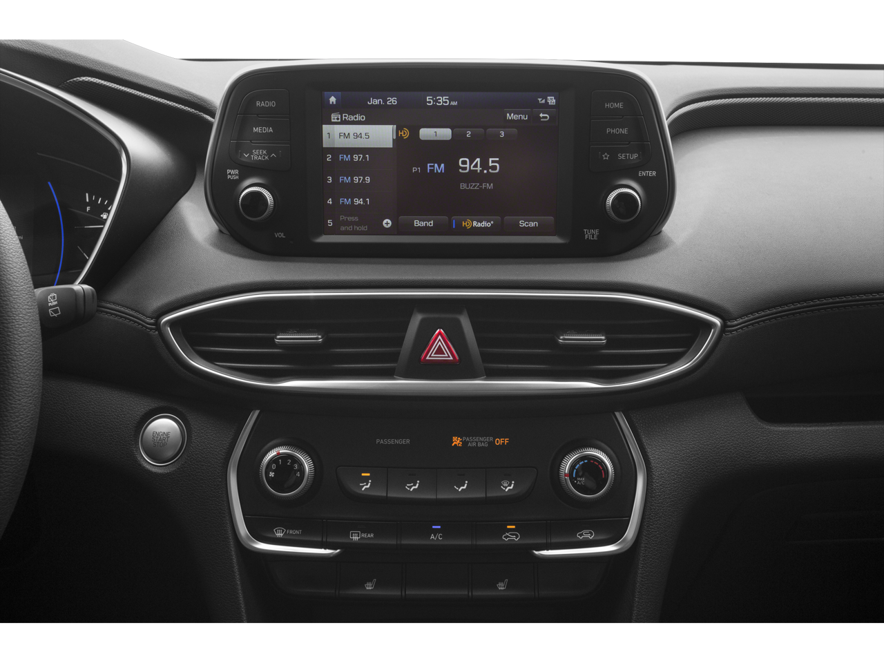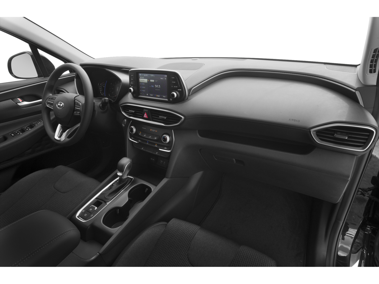 This Santa Fe SEL is nicely equipped with Convenience Package (18 x 7.5J Alloy Wheels, Acoustic-Laminated Front Side Windows, Auto-Dimming Inside Rear-View Mirror, Dual Automatic Temperature Control, Hands-Free Smart Liftgate w/Auto Open, Leather Wrapped Steering Wheel & Shift Knob, Manual Rear Side Sunshades, Option Group 02, Parking Distance Warning-Reverse, Radio: Infinity Premium AM/FM/MP3 Display Audio, Roof Side Rails, and Ultrasonic Rear Occupant Alert), 17 x 7.0J Alloy Wheels, 4-Wheel Disc Brakes, 6 Speakers, ABS brakes, Air Conditioning, Alloy wheels, AM/FM radio: SiriusXM, Apple CarPlay & Android Auto, Auto High-beam Headlights, Axle Ratio 3.798, Brake assist, Bumper Applique, Bumpers: body-color, Cargo Cover, Carpeted Floor Mats, Delay-off headlights, Driver door bin, Driver vanity mirror, Dual front impact airbags, Dual front side impact airbags, Electronic Stability Control, Emergency communication system, Exterior Parking Camera Rear, Four wheel independent suspension, Front anti-roll bar, Front Bucket Seats, Front Center Armrest, Front fog lights, Front reading lights, Fully automatic headlights, Heated door mirrors, Heated Front Bucket Seats, Heated front seats, Illuminated entry, Low tire pressure warning, Occupant sensing airbag, Outside temperature display, Overhead airbag, Overhead console, Panic alarm, Passenger door bin, Passenger vanity mirror, Power door mirrors, Power driver seat, Power steering, Power windows, Radio: AM/FM/MP3 Display Audio, Rear anti-roll bar, Rear seat center armrest, Rear window defroster, Rear window wiper, Remote keyless entry, Security system, Speed control, Speed-sensing steering, Split folding rear seat, Spoiler, Stain-Resistant Cloth Seating Surfaces, Steering wheel mounted audio controls, Tachometer, Telescoping steering wheel, Tilt steering wheel, Traction control, Trip computer, and Variably intermittent wipers.