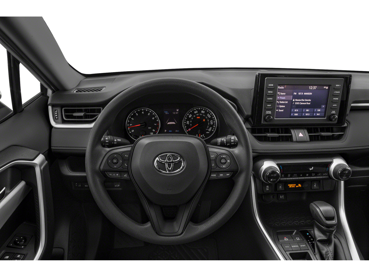 This RAV4 XLE is nicely equipped with 4-Wheel Disc Brakes, 6 Speakers, ABS brakes, Air Conditioning, Alloy wheels, AM/FM radio: SiriusXM, AM/FM Stereo, Apple CarPlay/Android Auto, Auto High-beam Headlights, Automatic temperature control, Axle Ratio: 3.177, Brake assist, Bumpers: body-color, Delay-off headlights, Driver door bin, Driver vanity mirror, Dual front impact airbags, Dual front side impact airbags, Electronic Stability Control, Emergency communication system, Exterior Parking Camera Rear, Fabric Seat Trim, Four wheel independent suspension, Front anti-roll bar, Front Bucket Seats, Front Center Armrest, Front dual zone A/C, Front fog lights, Front reading lights, Fully automatic headlights, Heated door mirrors, Illuminated entry, Knee airbag, Low tire pressure warning, Occupant sensing airbag, Outside temperature display, Overhead airbag, Overhead console, Panic alarm, Passenger door bin, Passenger vanity mirror, Power door mirrors, Power driver seat, Power steering, Power windows, Radio data system, Rear anti-roll bar, Rear seat center armrest, Rear window defroster, Rear window wiper, Remote keyless entry, Roof rack: rails only, Speed control, Speed-sensing steering, Split folding rear seat, Spoiler, Steering wheel mounted audio controls, Tachometer, Telescoping steering wheel, Tilt steering wheel, Traction control, Trip computer, Turn signal indicator mirrors, Variably intermittent wipers, and Wheels: 17 5-Spoke Silver Alloy.