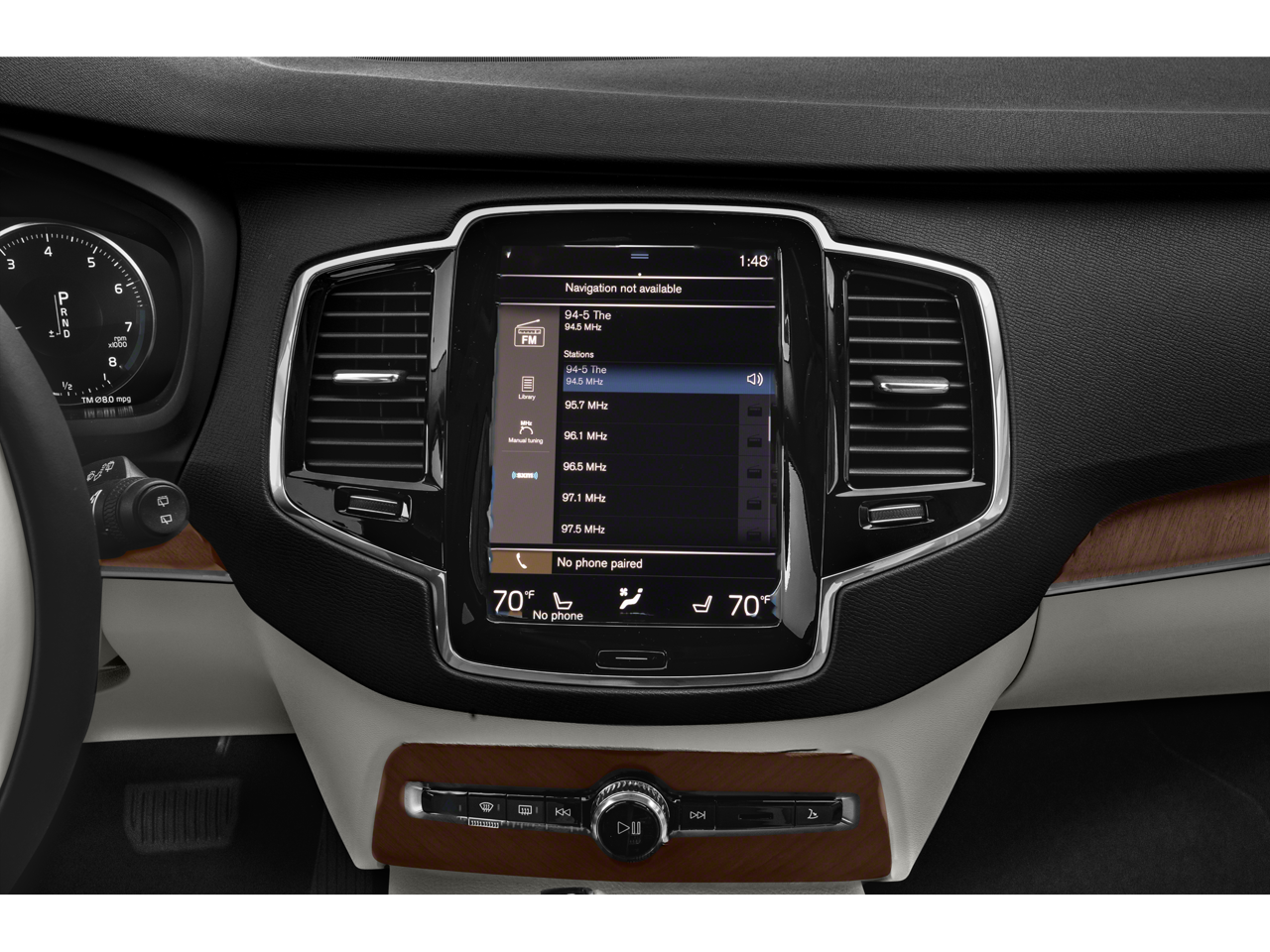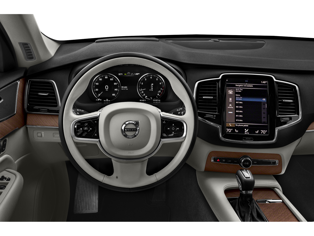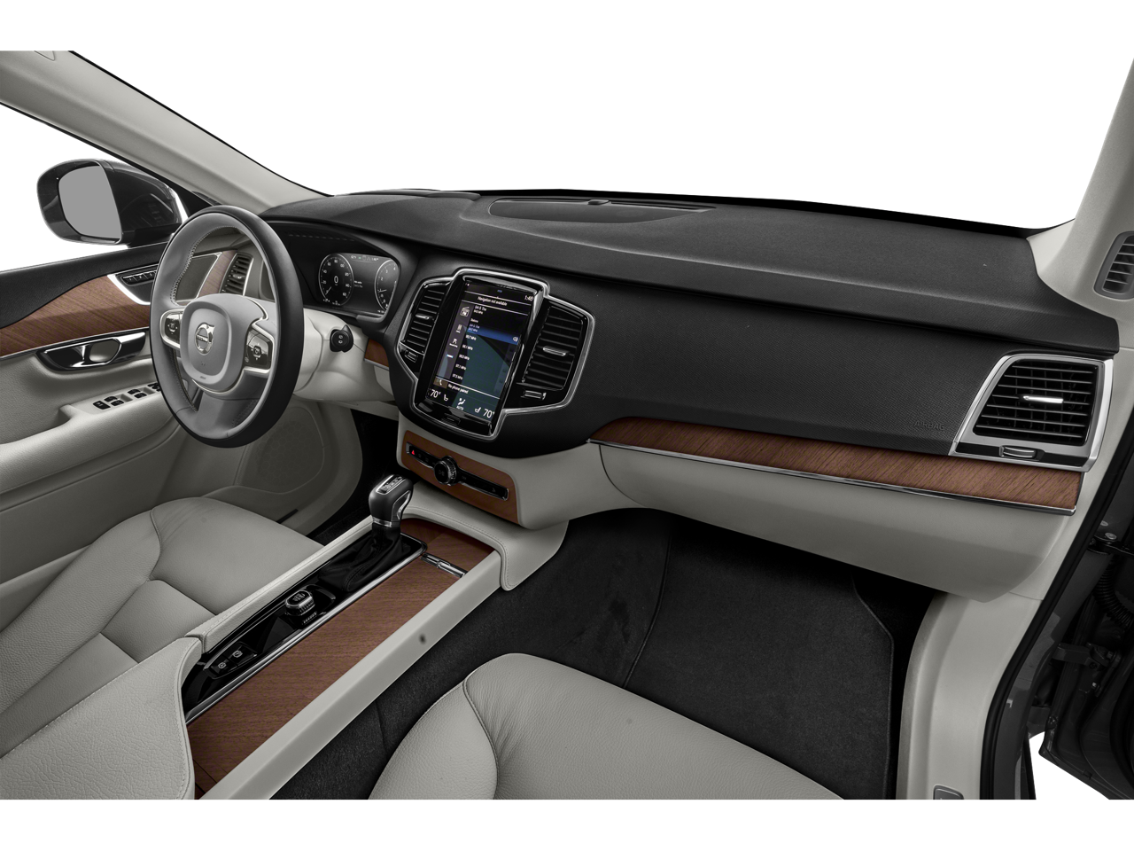 This XC90 T5 Momentum is nicely equipped with Protection Package Premier (Bumper Cover, Cargo Tray, License Plate Frame, Rubber Floor Mats, and Wheel Locks), 10 Speakers, 3rd row seats: bucket, 4-Wheel Disc Brakes, ABS brakes, Air Conditioning, Alloy wheels, AM/FM radio: SiriusXM, Anti-whiplash front head restraints, Apple CarPlay/Android Auto, Auto High-beam Headlights, Auto-dimming door mirrors, Auto-dimming Rear-View mirror, Automatic temperature control, Brake assist, Bumpers: body-color, Delay-off headlights, Driver door bin, Driver vanity mirror, Dual front impact airbags, Dual front side impact airbags, Electronic Stability Control, Emergency communication system: Volvo Cars App w/4 Year Subscription, Exterior Parking Camera Rear, Four wheel independent suspension, Front anti-roll bar, Front Bucket Seats, Front Center Armrest w/Storage, Front dual zone A/C, Front fog lights, Front reading lights, Fully automatic headlights, Garage door transmitter: HomeLink, Heated door mirrors, Heated front seats, Illuminated entry, Knee airbag, Leather Shift Knob, Leatherette Upholstery, Low tire pressure warning, Memory seat, Navigation system: Sensus Navigation, Occupant sensing airbag, Outside temperature display, Overhead airbag, Panic alarm, Passenger door bin, Passenger vanity mirror, Power door mirrors, Power driver seat, Power moonroof, Power passenger seat, Power steering, Power windows, Premium audio system: Sensus Connect, Radio data system, Radio: High Performance Audio System, Rain sensing wipers, Rear air conditioning, Rear anti-roll bar, Rear dual zone A/C, Rear fog lights, Rear reading lights, Rear seat center armrest, Rear window defroster, Rear window wiper, Remote keyless entry, Security system, Speed control, Speed-sensing steering, Split folding rear seat, Spoiler, Steering wheel mounted audio controls, Tachometer, Telescoping steering wheel, Tilt steering wheel, Traction control, Trip computer, Turn signal indicator mirrors, Variably intermittent wipers, Wheels: 19 6-Spoke Turbine Sparkling Silver Alloy, and Wheels: 20 5-Multi Spoke Matte Graphite Alloy.