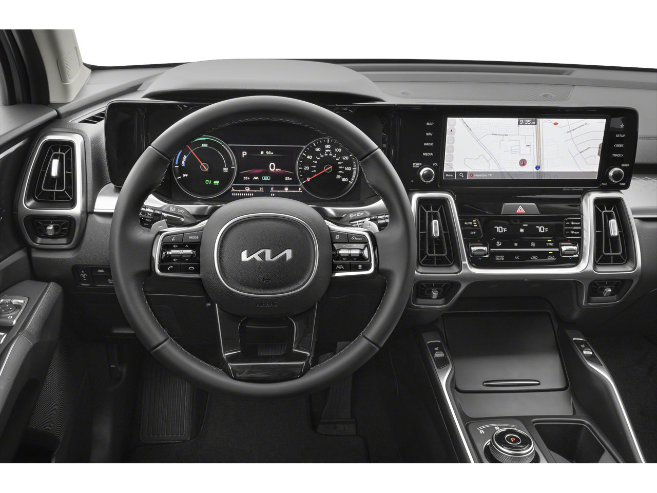 This Sorento Hybrid EX is nicely equipped with 3rd row seats: split-bench, 4-Wheel Disc Brakes, 6 Speakers, ABS brakes, Air Conditioning, Alloy wheels, AM/FM radio: SiriusXM, Apple CarPlay & Android Auto, Auto High-beam Headlights, Automatic temperature control, Axle Ratio: 3.510, Brake assist, Bumpers: body-color, Carpet Floor Mats, Delay-off headlights, Driver door bin, Driver vanity mirror, Dual front impact airbags, Dual front side impact airbags, Electronic Stability Control, Emergency communication system: 911 Connect, Exterior Parking Camera Rear, Four wheel independent suspension, Front anti-roll bar, Front Bucket Seats, Front Center Armrest, Front dual zone A/C, Front fog lights, Front reading lights, Fully automatic headlights, Heated door mirrors, Heated Front Bucket Seats, Heated front seats, Illuminated entry, Knee airbag, Leather steering wheel, Low tire pressure warning, Navigation System, Occupant sensing airbag, Outside temperature display, Overhead airbag, Overhead console, Panic alarm, Passenger door bin, Passenger vanity mirror, Power door mirrors, Power driver seat, Power Liftgate, Power passenger seat, Power steering, Power windows, Radio data system, Radio: AM/FM/SiriusXM Audio System, Rear air conditioning, Rear anti-roll bar, Rear reading lights, Rear window defroster, Rear window wiper, Remote keyless entry, Security system, Smart Key w/ Push Button and Remote Start, Speed control, Speed-sensing steering, Split folding rear seat, Spoiler, Steering wheel mounted audio controls, SynTex Artificial Leather Seat Trim, Tachometer, Telescoping steering wheel, Tilt steering wheel, Traction control, Trip computer, Turn signal indicator mirrors, Variably intermittent wipers, and Wheels: 19 Machine-Finished Aero Alloy.