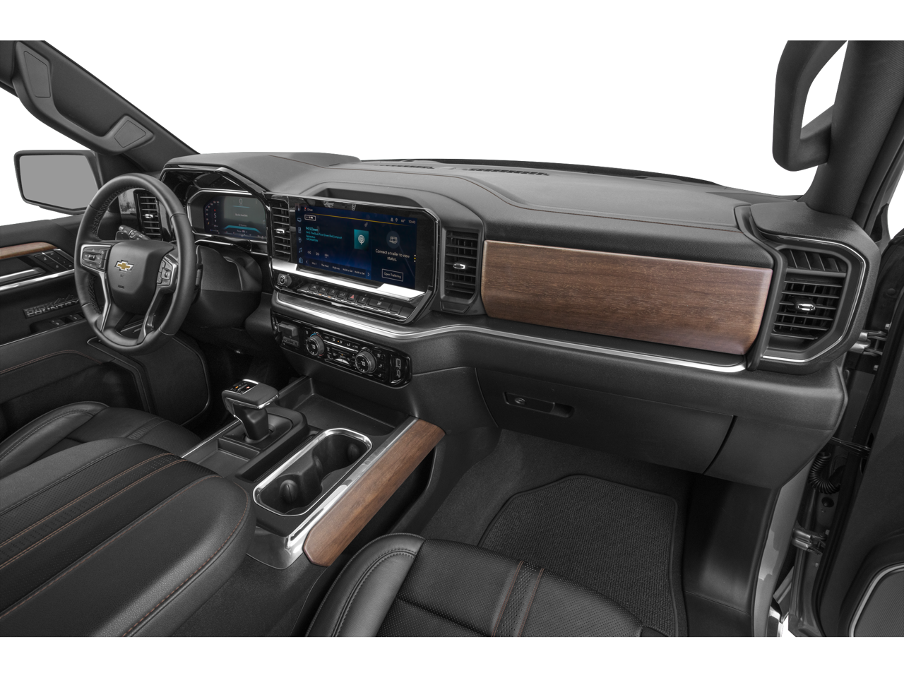 This Silverado 1500 High Country is nicely equipped with High Capacity Suspension Package, Preferred Equipment Group 3LZ (12.3 Multicolor Reconfigurable Digital Display, 120-Volt Bed Mounted Power Outlet, 120-Volt Interior Power Outlet, 2 USB Data Ports, 2nd Row Heated Outboard Seats, Adaptive Cruise Control, Auto-Dimming Inside Rear-View Mirror, Auto-Locking Rear Differential, Bed View Camera, Bluetooth® For Phone, Chrome Assist Steps, Chrome Recovery Hooks, Color-Keyed Carpeting Floor Covering, Deep-Tinted Glass, Driver Memory, Electric Rear-Window Defogger, Floor Mounted Center Console, Front Bucket Seats, Front Carpeted Floor Mats, Front LED Fog Lamps, Front Rain-Sensing Wipers, Galvano Silver Painted Mirror Caps, HD Surround Vision, Heated Steering Wheel, Integrated Trailer Brake Controller, LED Cargo Area Lighting, OnStar Services Capable, Outside Heated Power-Adjustable Mirrors, Perforated Leather Seat Trim, Perimeter Lighting, Power Tailgate, Rear Carpeted Floor Mats, Rear Cross Traffic Braking, Rear Pedestrian Alert, Rear Wheelhouse Liners, Remote Vehicle Starter System, Safety Alert Seat, Standard Tailgate, Steering Wheel Audio Controls, Teen Driver, Tire Pressure Monitoring System, Trailer Camera Provisions, Trailer Side Blind Zone Alert, Universal Home Remote, Wheels: 20 x 9 Painted Aluminum, Wi-Fi Hot Spot Capable, and Wrapped Steering Wheel), Technology Package (15 Diagonal Multicolor Head-Up Display and Rear Camera Mirror), Trailering Package (Hitch Guidance), 170 Amp Alternator, 3.23 Rear Axle Ratio, 4-Wheel Disc Brakes, 7 Speakers, ABS brakes, Adaptive Ride Control Suspension, Air Conditioning, Alloy wheels, AM/FM radio: SiriusXM with 360L, Apple CarPlay/Android Auto, Auto High-beam Headlights, Auto-dimming door mirrors, Auto-dimming Rear-View mirror, Automatic temperature control, Bodyside moldings, Brake assist, Bumpers: body-color, Compass, Delay-off headlights, Driver door bin, Driver vanity mirror, Dual Active Exhaust, Dual front impact airbags, Dual front side impact airbags, Electronic Stability Control, Electronic Transmission Range Selector Shifter, Emergency communication system: OnStar, Enhanced Automatic Emergency Braking, Following Distance Indicator, Forward Collision Alert, Front anti-roll bar, Front Center Armrest, Front dual zone A/C, Front fog lights, Front Pedestrian Braking, Front reading lights, Front wheel independent suspension, Fully automatic headlights, Garage door transmitter, Genuine wood console insert, Genuine wood dashboard insert, Genuine wood door panel insert, Heated door mirrors, Heated front seats, Heated rear seats, Heated steering wheel, Illuminated entry, Low tire pressure warning, Memory seat, Occupant sensing airbag, Outside temperature display, Overhead airbag, Overhead console, Panic alarm, Passenger door bin, Passenger vanity mirror, Power door mirrors, Power driver seat, Power passenger seat, Power steering, Power windows, Premium audio system: Chevrolet Infotainment 3 Premium, Premium Bose 7-Speaker Sound System, Radio data system, Radio: Chevrolet Infotainment 3 Premium System, Rain sensing wipers, Rear reading lights, Rear seat center armrest, Rear step bumper, Rear window defroster, Remote keyless entry, Security system, Speed control, Speed-sensing steering, Split folding rear seat, Steering wheel mounted audio controls, Tachometer, Telescoping steering wheel, Tilt steering wheel, Traction control, Trip computer, Variably intermittent wipers, Ventilated front seats, Voltmeter, and Wheels: 22 x 9 Painted Aluminum.