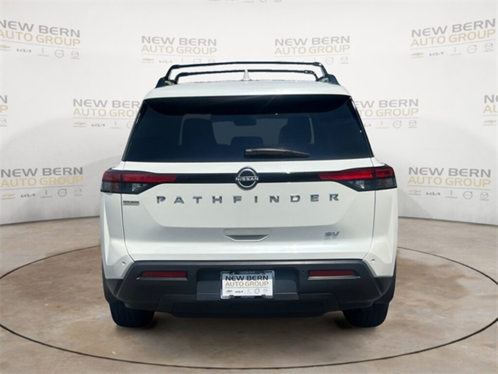 This Pathfinder SV is nicely equipped with 18" Painted Alloy Wheels, 3rd row seats: bench, 4-Wheel Disc Brakes, 6 Speakers, ABS brakes, Air Conditioning, Alloy wheels, AM/FM radio: SiriusXM, Auto High-beam Headlights, Automatic temperature control, Axle Ratio: TBD, Bench Seat Carpeted Floor Mats (Set of 4), Black Splash Guards (Set of 4), Brake assist, Bumpers: body-color, Cloth Seating Surfaces, Cross Bars, Delay-off headlights, Driver door bin, Driver vanity mirror, Dual front impact airbags, Dual front side impact airbags, Electronic Stability Control, Emergency communication system: NissanConnect Services, Four wheel independent suspension, Front anti-roll bar, Front Bucket Seats, Front Center Armrest, Front dual zone A/C, Front reading lights, Fully automatic headlights, Heated door mirrors, Heated Front Bucket Seats, Heated front seats, Illuminated entry, Knee airbag, Leather steering wheel, Low tire pressure warning, NissanConnect featuring Apple CarPlay and Android Auto, Occupant sensing airbag, Outside temperature display, Overhead airbag, Overhead console, Panic alarm, Passenger door bin, Passenger vanity mirror, Power door mirrors, Power driver seat, Power steering, Power windows, Radio data system, Radio: AM/FM Audio System w/NissanConnect, Rear air conditioning, Rear anti-roll bar, Rear Parking Sensors, Rear reading lights, Rear seat center armrest, Rear side impact airbag, Rear window defroster, Rear window wiper, Reclining 3rd row seat, Remote keyless entry, Security system, Speed control, Speed-sensing steering, Split folding rear seat, Spoiler, Steering wheel mounted audio controls, Tachometer, Telescoping steering wheel, Tilt steering wheel, Traction control, Trip computer, Turn signal indicator mirrors, and Variably intermittent wipers.